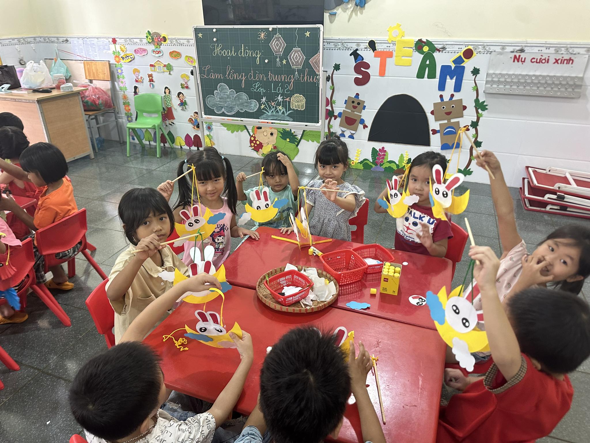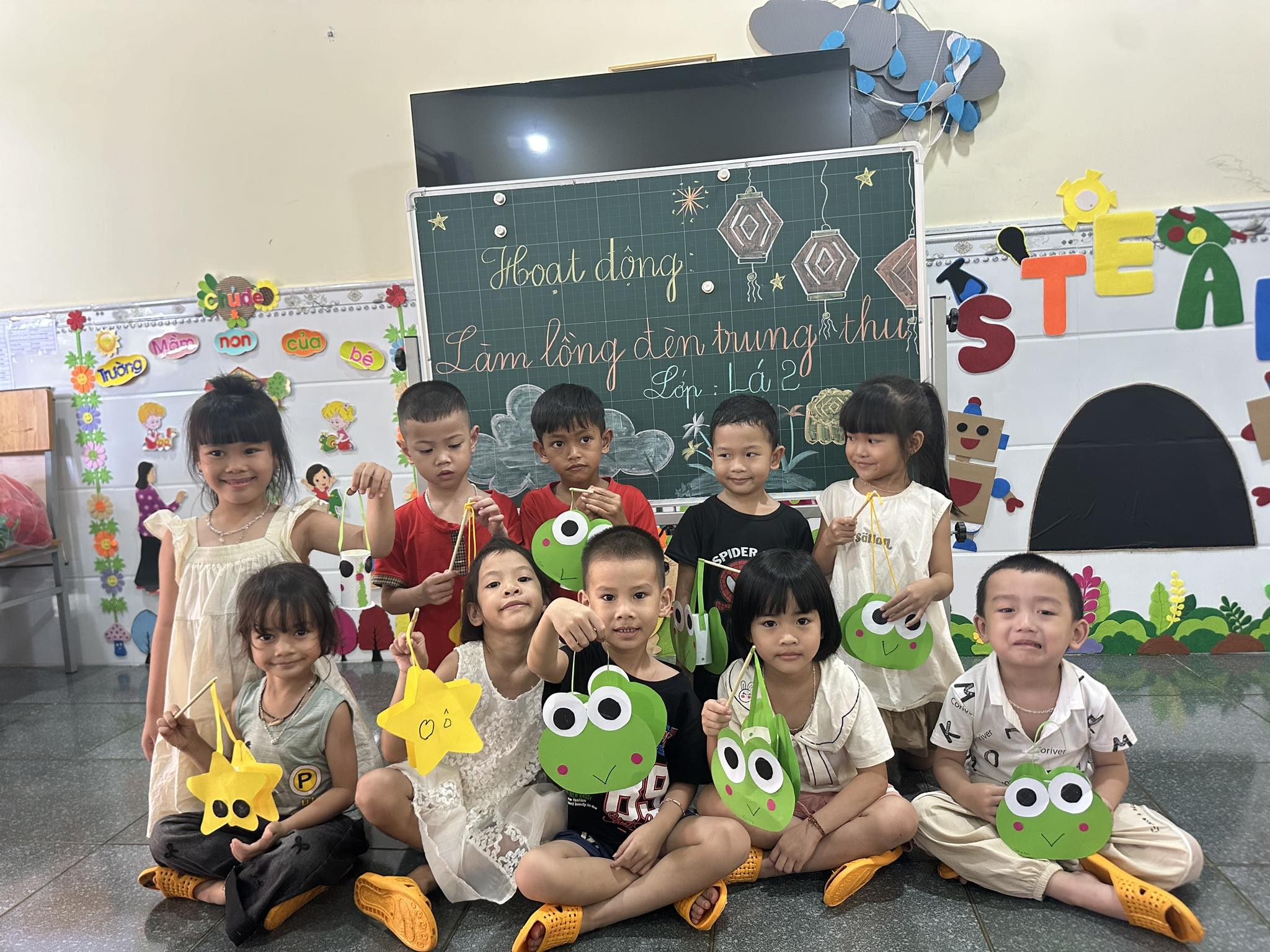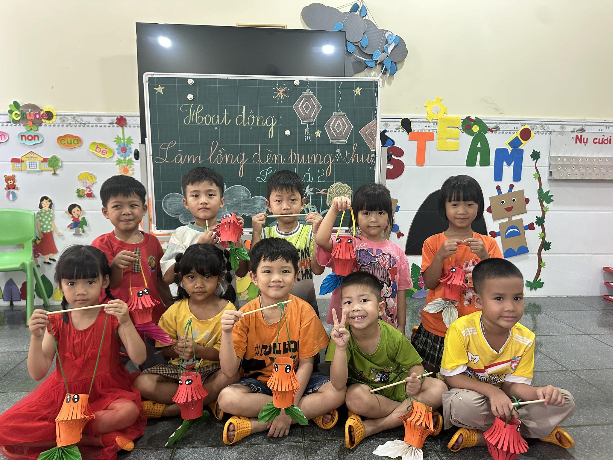 Để làm nên chiếc đèn lồng khoe sắc trong ngày hội trăng rằm, cô và trò Lớp Lá 2 đã sử dụng những chất liệu dễ kiếm như giấy bìa màu, que tre, dây treo, chai lọ, lõi giấy vệ sinh… Dưới sự hướng dẫn tận tình của cô giáo, các con đã sáng tạo thêm cho chiếc đèn lồng của mình những họa tiết xinh xắn, dễ thương.