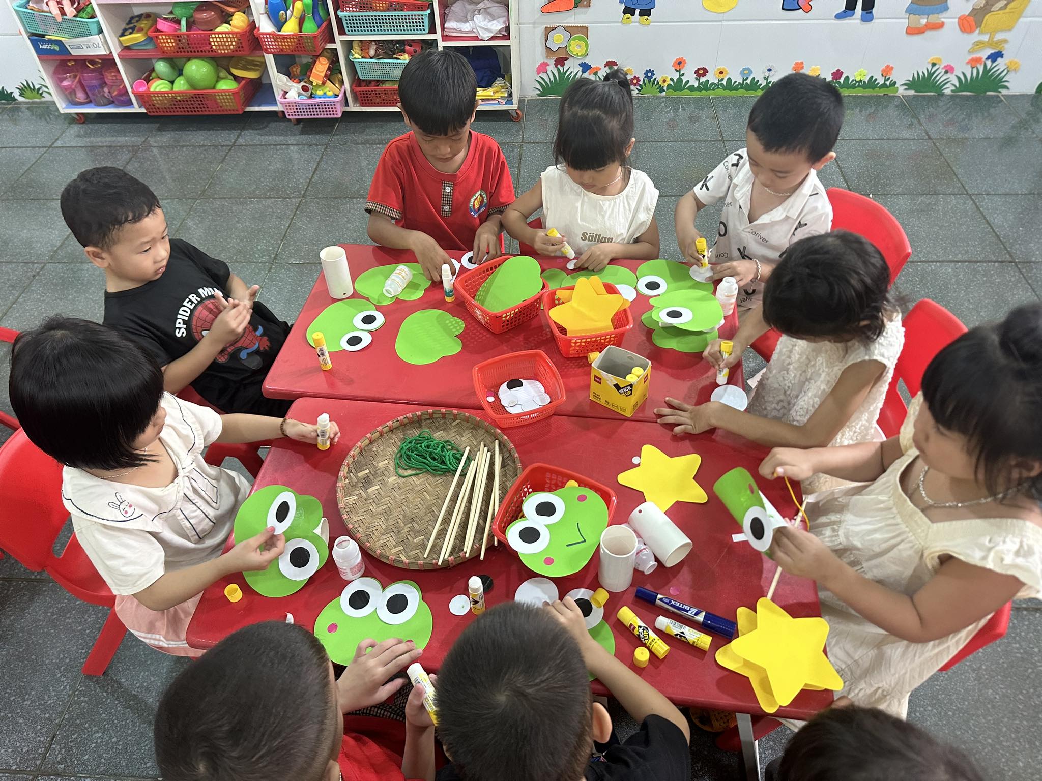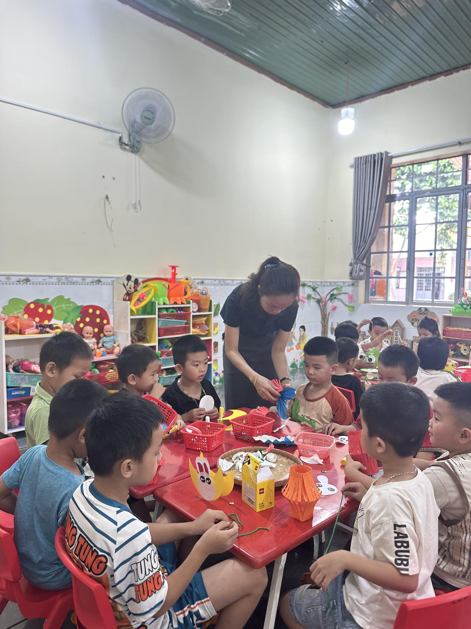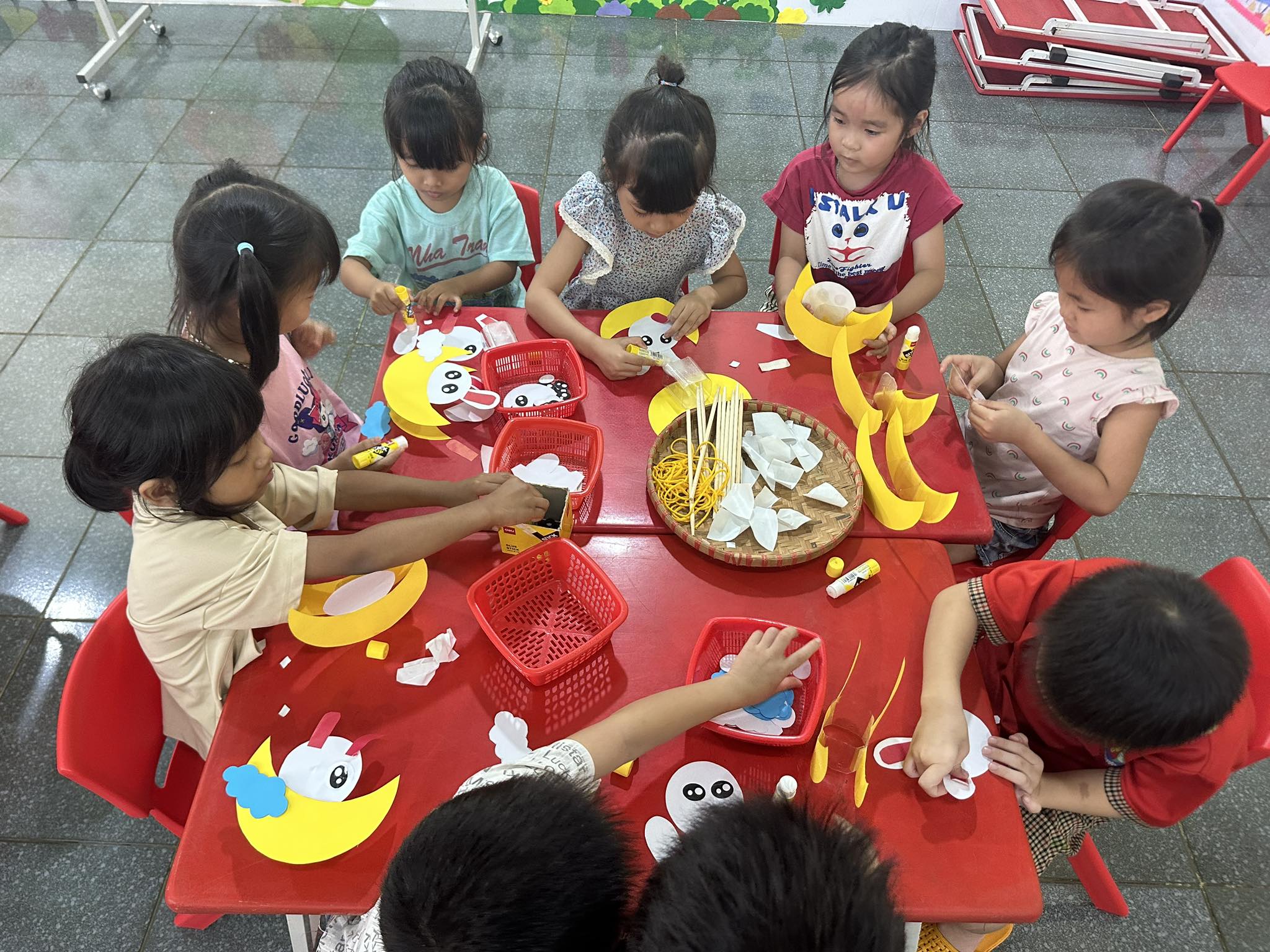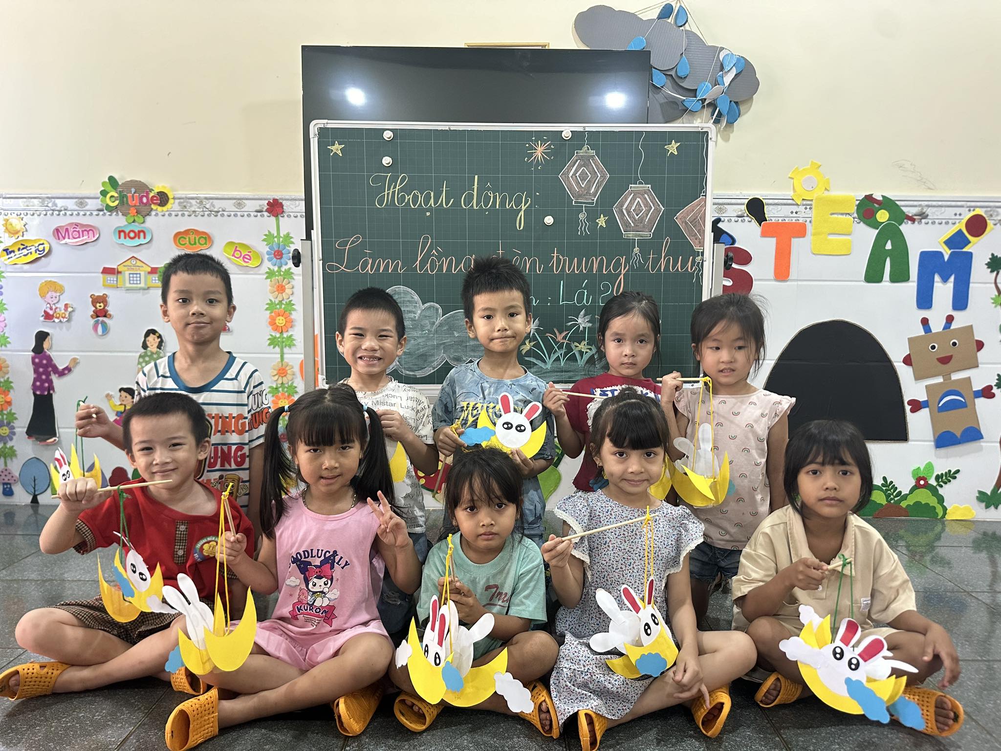 Để làm nên chiếc đèn lồng khoe sắc trong ngày hội trăng rằm, cô và trò Lớp Lá 2 đã sử dụng những chất liệu dễ kiếm như giấy bìa màu, que tre, dây treo, chai lọ, lõi giấy vệ sinh… Dưới sự hướng dẫn tận tình của cô giáo, các con đã sáng tạo thêm cho chiếc đèn lồng của mình những họa tiết xinh xắn, dễ thương.